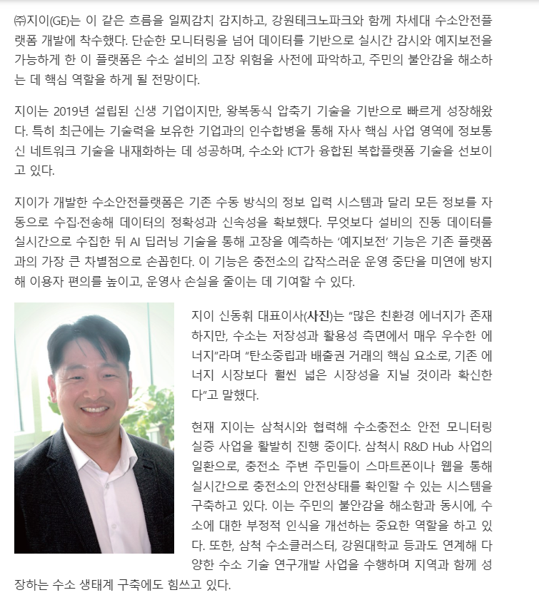 ㈜지이는 강원테크노파크와 함께 수소 설비의 예지보전 기능을 갖춘 '수소안전플랫폼'을 개발하며,