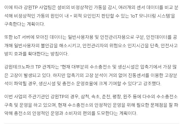 IoT 기반 안전관리 시스템 설치, 진동, 가스, 화염감지 센서 설치, 데이터 저장 및 분석을 위한 플랫폼 개발, 수소튜브트레일러에 이동형 안전모니터링 시스템 탑재, 엣지서버 및 원격 모니터링 제어 시스템을 구축하고 있습니다.
