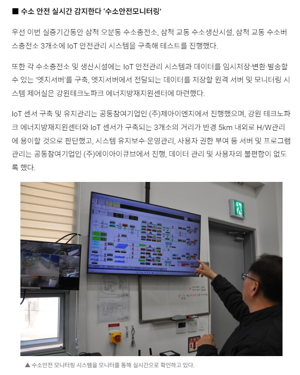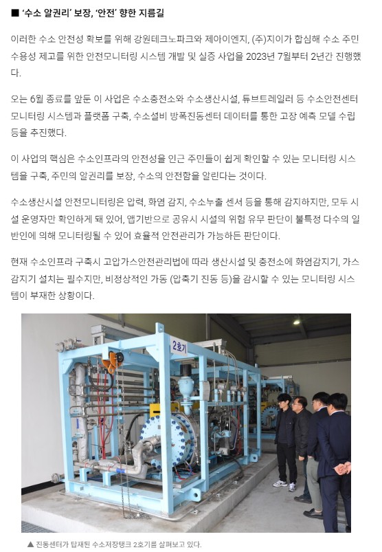 강원테크노파크에서 주관하는 수소 안전 모니터링 실증 사업이 2023년 7월부터 2025년 6월까지 진행 중이며,