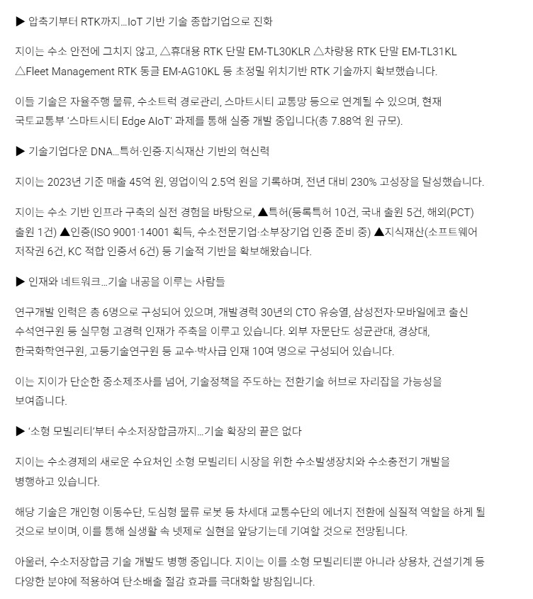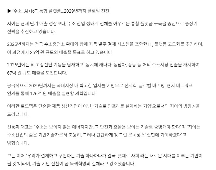 “지이는 보이지 않는 수소를 ‘보이는 기술’로 구현하며, 조용하지만 단단하게 ‘K-그린 르네상스’를 실현하겠습니다.”